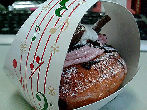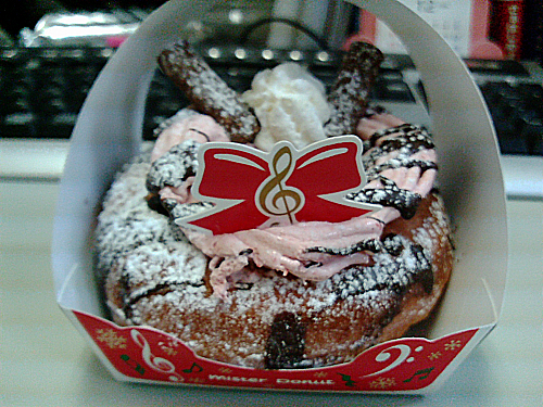 去年のクリスマスドーナツは、ポンデライオンとかのキャラクターを全面にだして、おこちゃまカワイイ系だったけど、ことしは映画の「のだめカンタービレ」に協賛もしてるからCMものだめの玉木宏さんだし、どっちかってゆーと大人っぽい仕上がり。