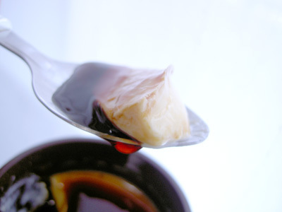 とろ~~んと、葛あんのようとろみのある濃いめのカラメルソース。ふわ~っとラム酒風の香りがする。