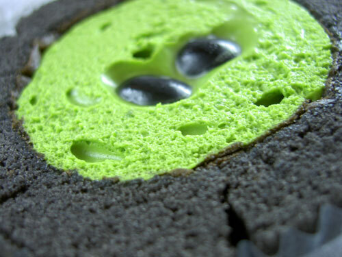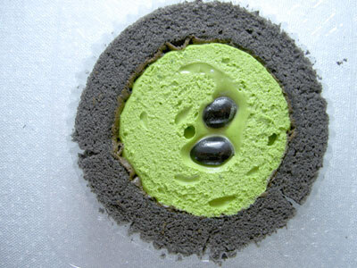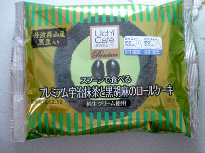 お抹茶物は以前にも「プレミアム宇治抹茶ロールケーキ」ってゆーのが出てて、その時にはスポンジもお抹茶味だったけど、今回はスポンジのところがまっくろくろすけ。胡麻と竹炭の色らしい。(プレミアム宇治抹茶ロールケーキに関する以前の記事はこちら)
