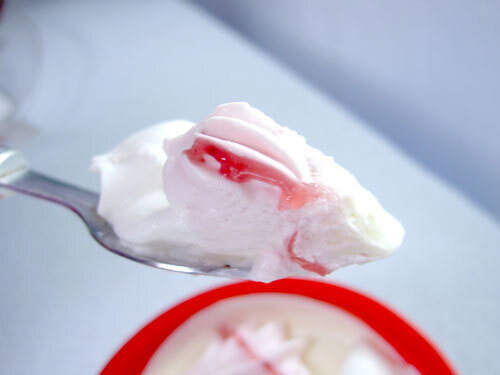 なめらか~で一瞬にして溶けてなくなる~~。甘酸っぱいストロベリーソースとの相性も抜群。とろける、とろける~ぅ。チーズ味は濃厚な方でそこそこの酸味。