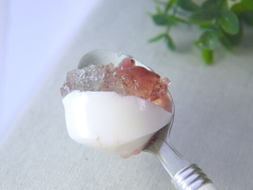 真っ白杏仁豆腐に半分苺が2つ乗っかってて、透明のクラッシュゼリーといちごソース。