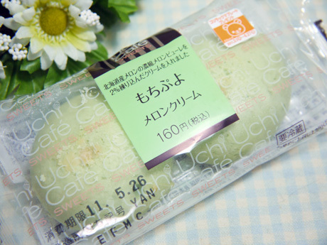 ちなみに、ローソンサイトの商品情報には「発売日:2011年5月24日 緑色のもっちりとした一口サイズのパフに、北海道赤肉メロンのピューレを使用したクリームを入れました。」とあるので、使用してるメロンは赤肉系らしい。でも、品種は言えない。