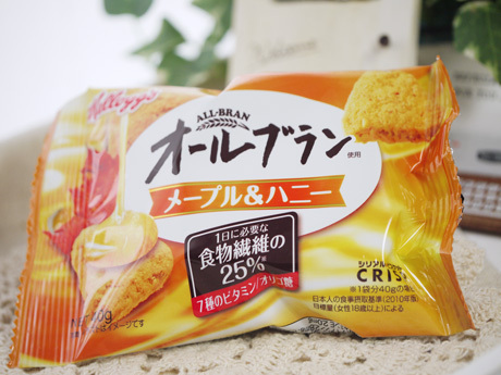 「食物繊維豊富な小麦外皮(ブラン)が主原料のオールブランを、自然な甘さのメープル&ハニー風味に焼き上げた、ひとくちサイズのシリアル・ビスケットです。この製品1袋分で、食物繊維が約4.9g摂れます。」ケロッグの商品情報より。