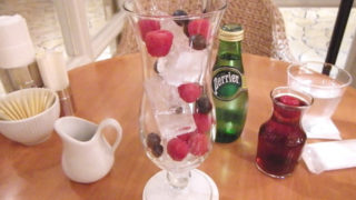 パンケーキは全部で5枚。薄めでモッチリですが、深さのあるお皿なのでナイフで切りにくく、ボロボロになってしまいます。バターの風味がたっぷりで、こってりとしててほのかな塩味。フルーツが生じゃなくて瓶詰めっぽい…この季節は生のいちごやブルーベリーの入手が難しいのだと思うけど、ちょっとがっかりかな。